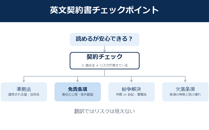「翻訳サイトで訳したら大体意味は理解できた。でも原文を読めないので翻訳の正しさはチェックできない」「標準的な内容に見える。でも本当に標準的かリスクがないかは測りかねている」「よくわかっていないところもあるが、大丈夫だろう。日本語の契約書よりも修正や交渉は難しいから、このまま進めようか」 ーー 英文契 […]